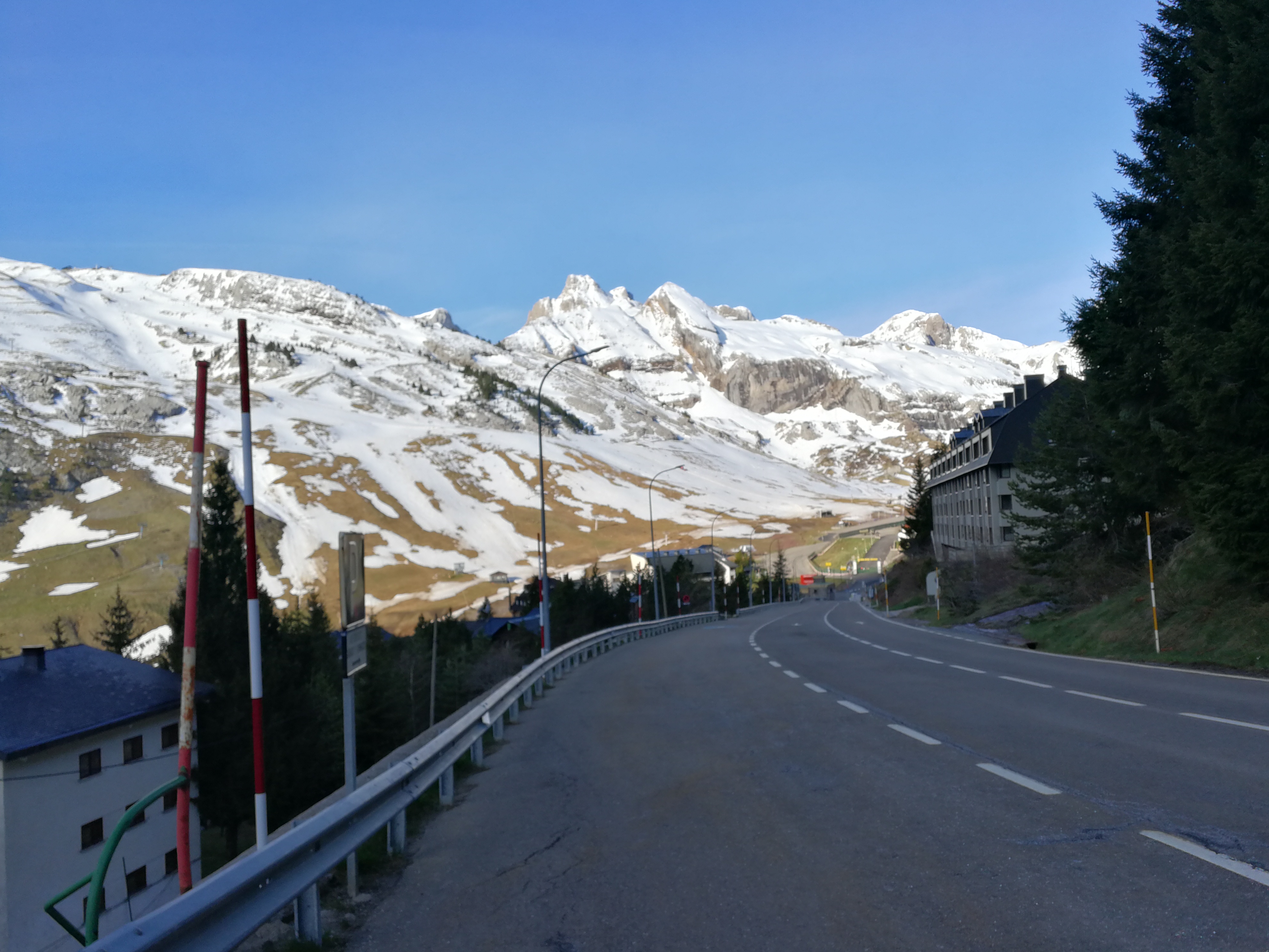After breakfast out and down the hill to Candanchu. It is a rather big ski resort with a number of hotels located at less than a kilometer from the border. Lots of houses and service. Saw a pist machine creeping up one of the snowy “pista de esquí” of the mountain at the other side of the resort valley.