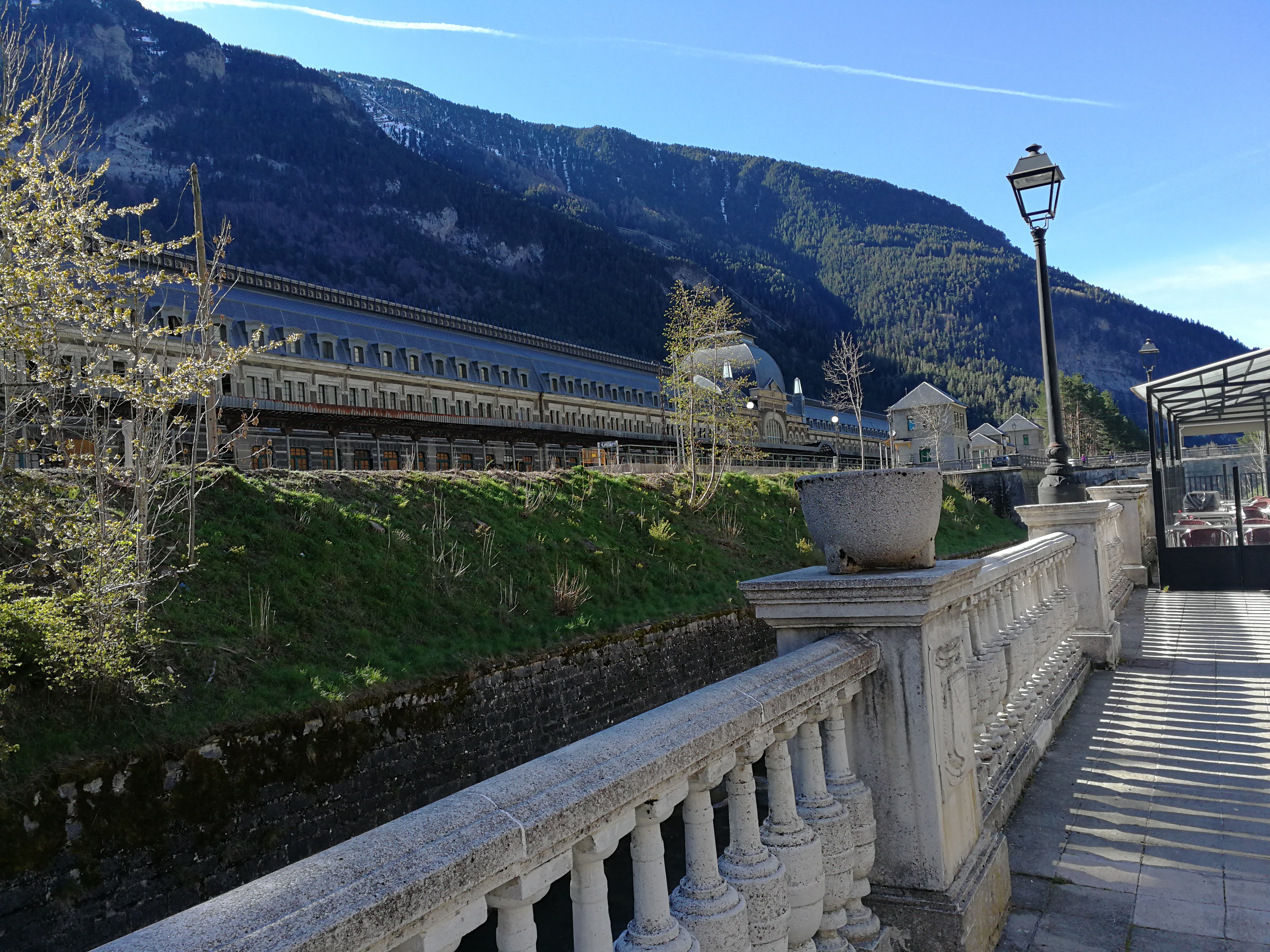 Eventually did I reach “Canfranc Estación” a fairly big place with what seemed to be apartment houses. Maybe used as a resort. And of course, the railway station with its monumental station house. Earlier Europe’s third station in size. Why? Well, you needed to change train here since the railway tracks in Spain and France have different width. And this was the main connection between the two countries. Was built between the two world wars and was again inaugurated 1944. But today almost 50 years after the bad accident that closed the connection – a ghost house, that one now tries to revive. Restoration is on its way. I wonder what it will be used for. There was a lot of money invested in this link between the two countries. Today, as far as I could see no trains at the station. But I checked and it is used for local traffic from this station, like on the French side.