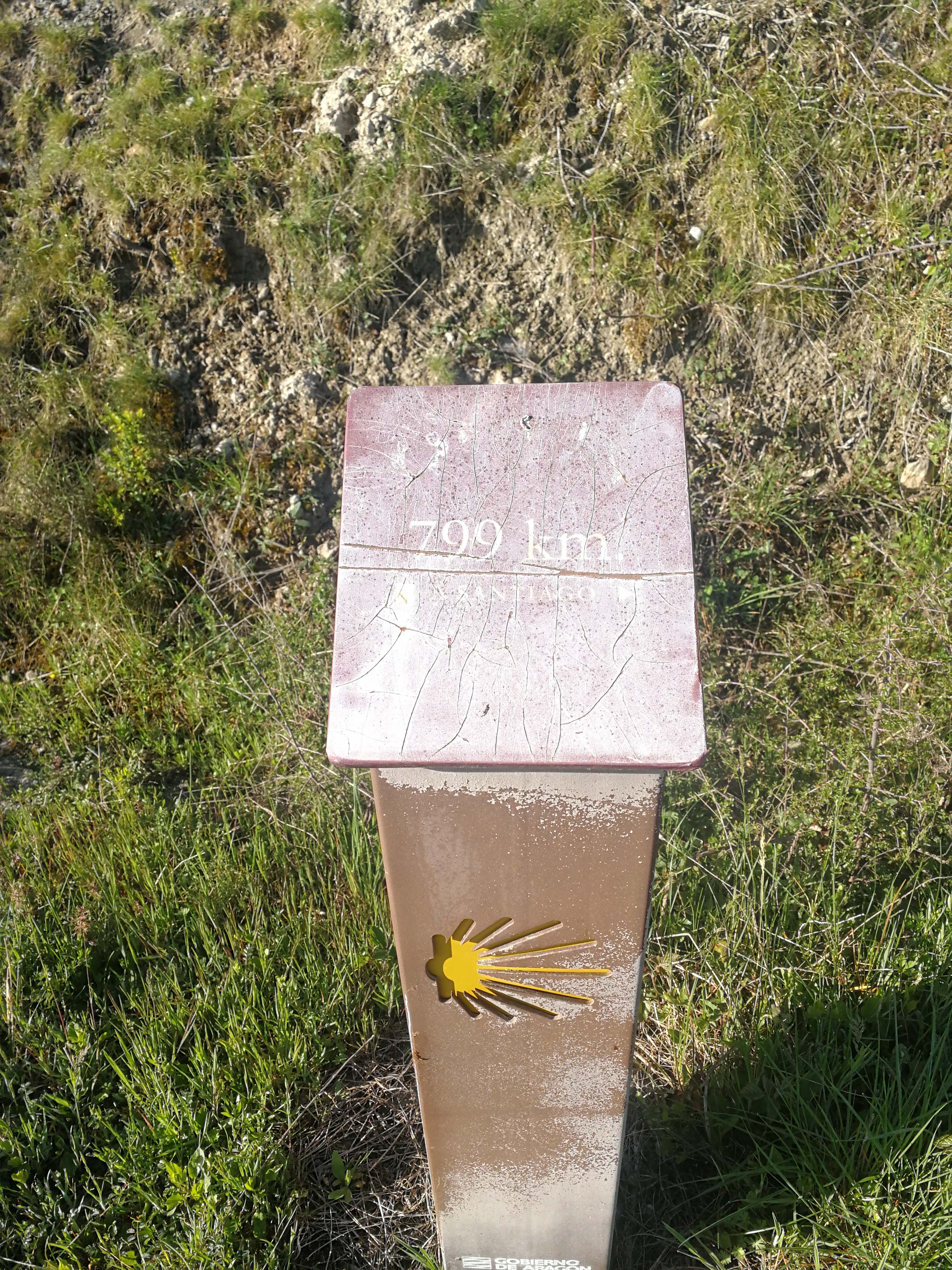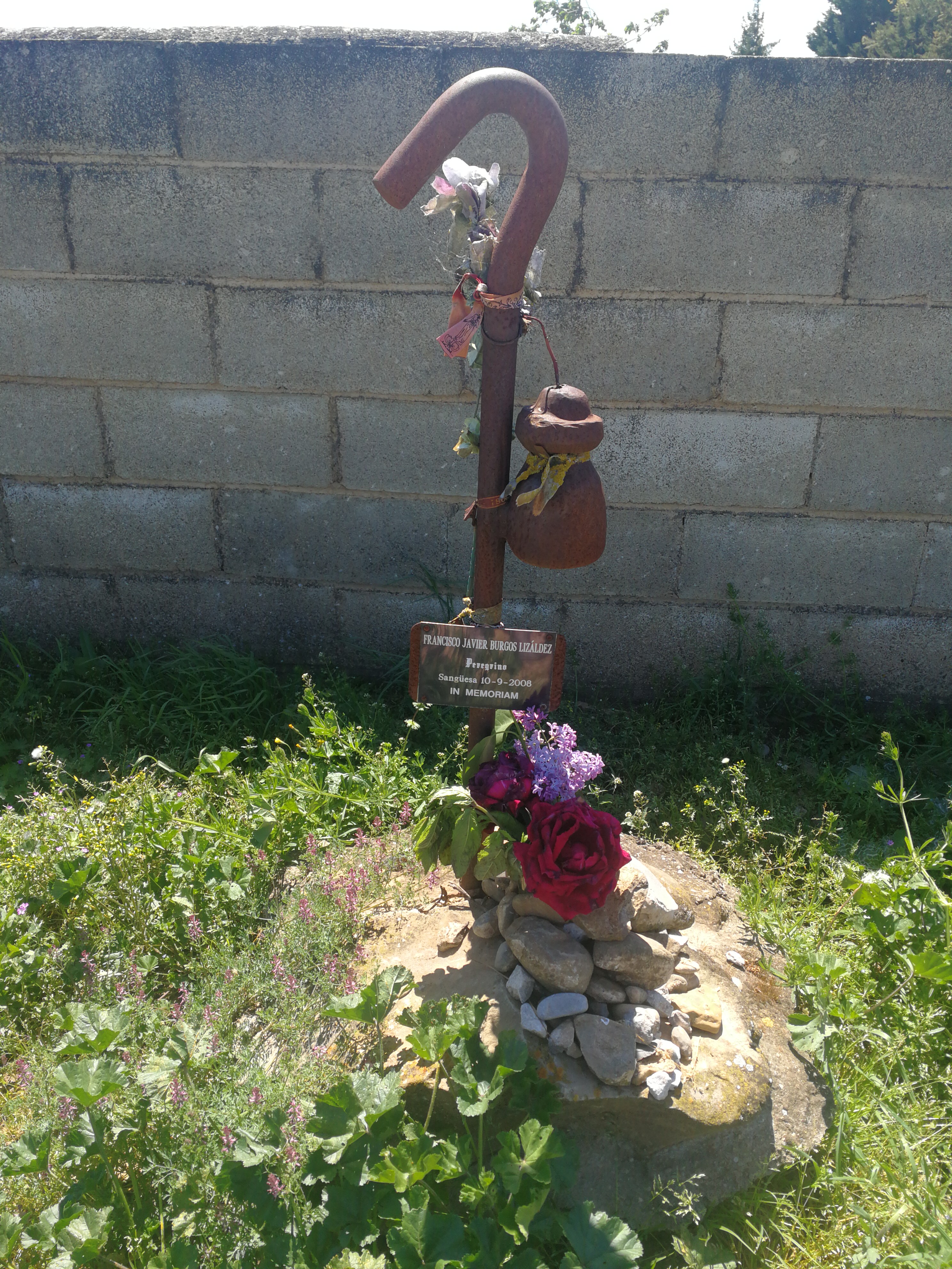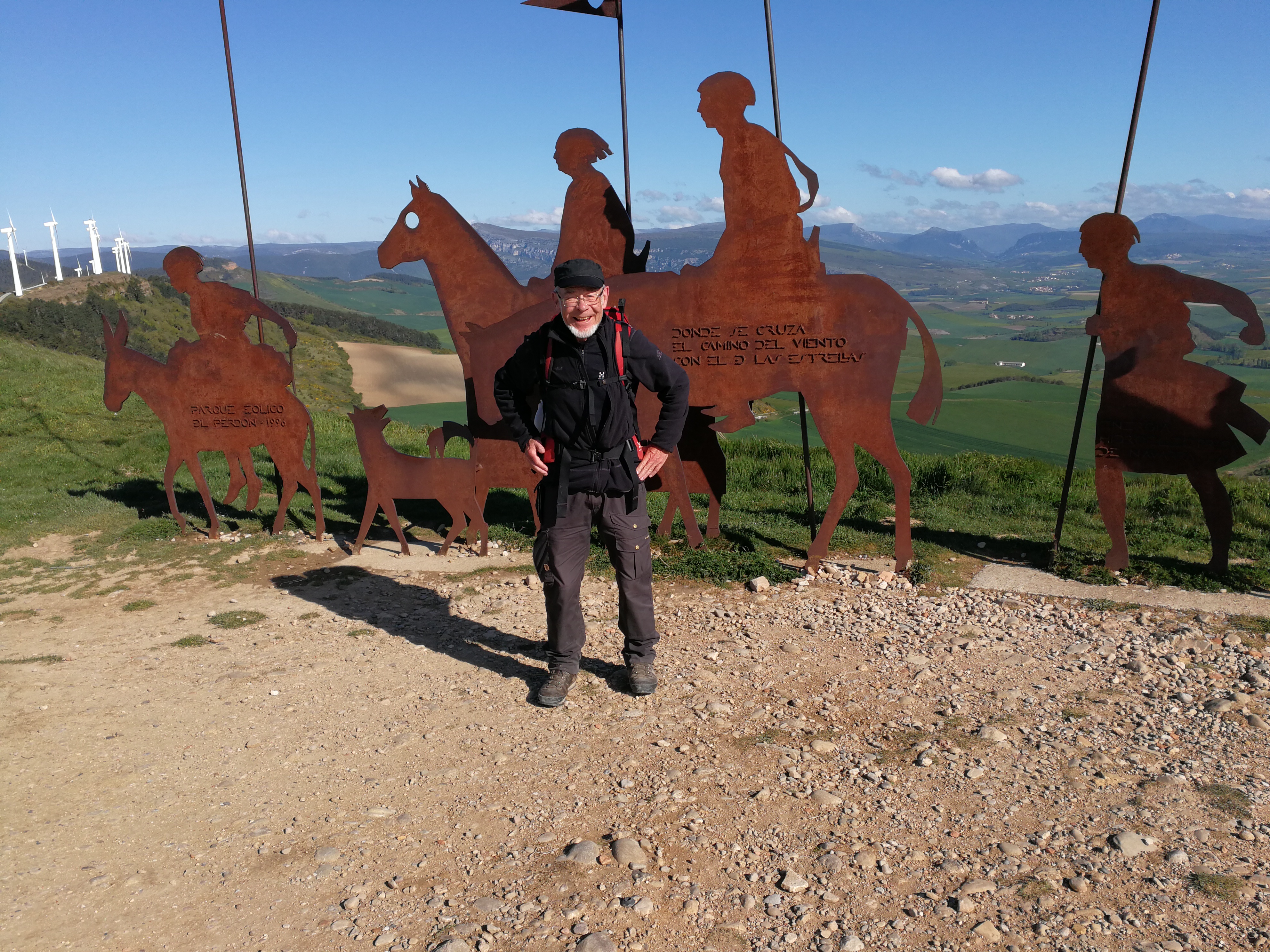 Well, at the top near the famous silhouettes I they had introduced a service van where you could buy refreshments just like at the top of the hill from St-Jean! That’s new! A lot of people taking photos. One of them also helped me to take the necessary photo of me in front of the metal pilgrims. Sent a message to Bosse J, my old friend, who is using a photo of these rusty pilgrims as his signature.