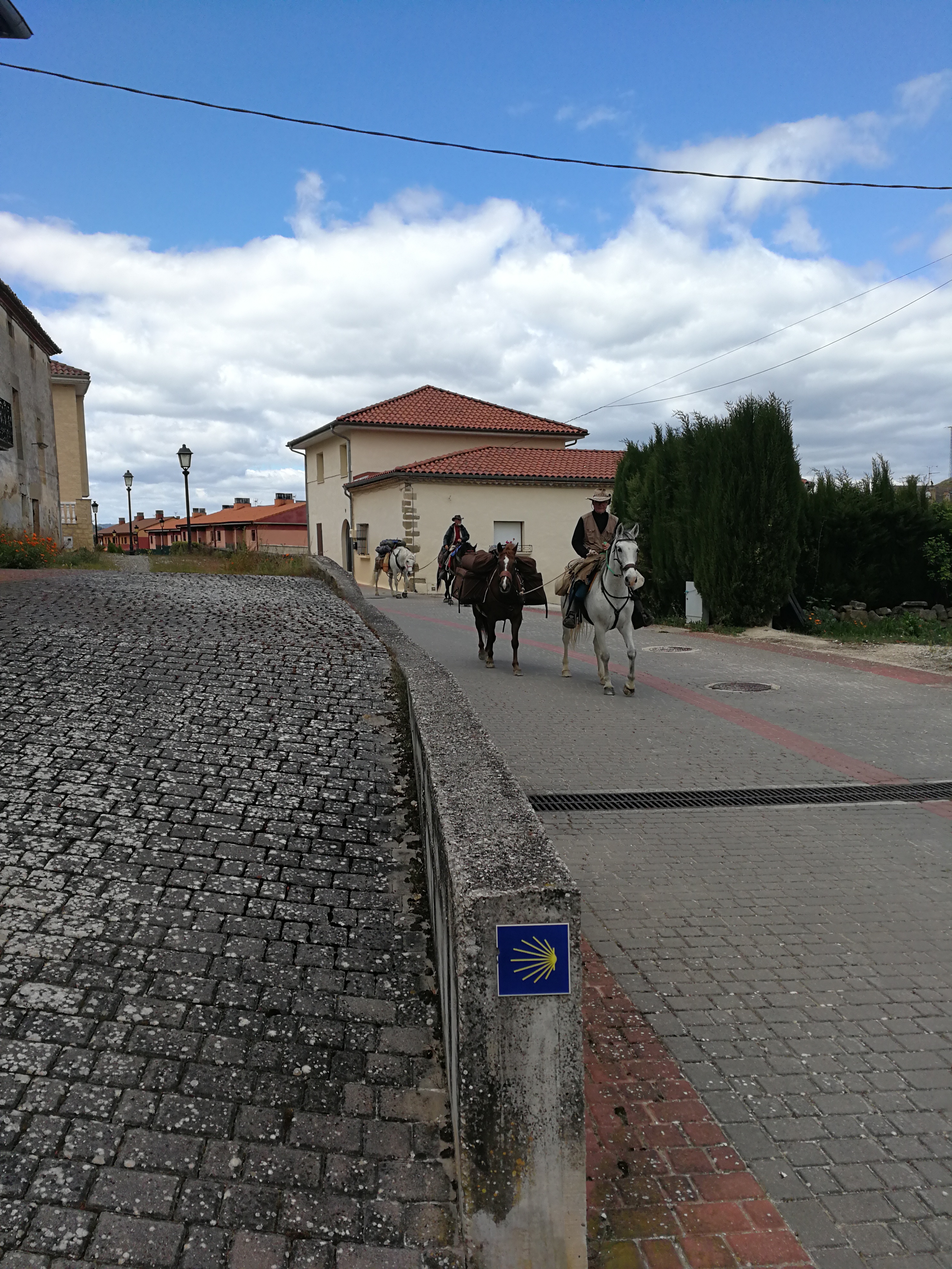 hour. But it had to work anyway. Walked on small paths mostly. A bit wider around some villages. It continued like that all the way to Tiebas where I finally could get some food. Had it together with the French couple that I had met in Monreal. But before I fund this place in Tiebas I had been sitting on a stone at the edge of a village to eat my spare backpack bread. Then came two dogs and took my piece of bread, two dogs with radio trackers on their collars. They belong to a hunter a bit away. But he did not see what happened.  Leaving Tiebas I met two pilgrims – at least I believe them to be that – on horseback plus one additional horse each to carry their equipment.