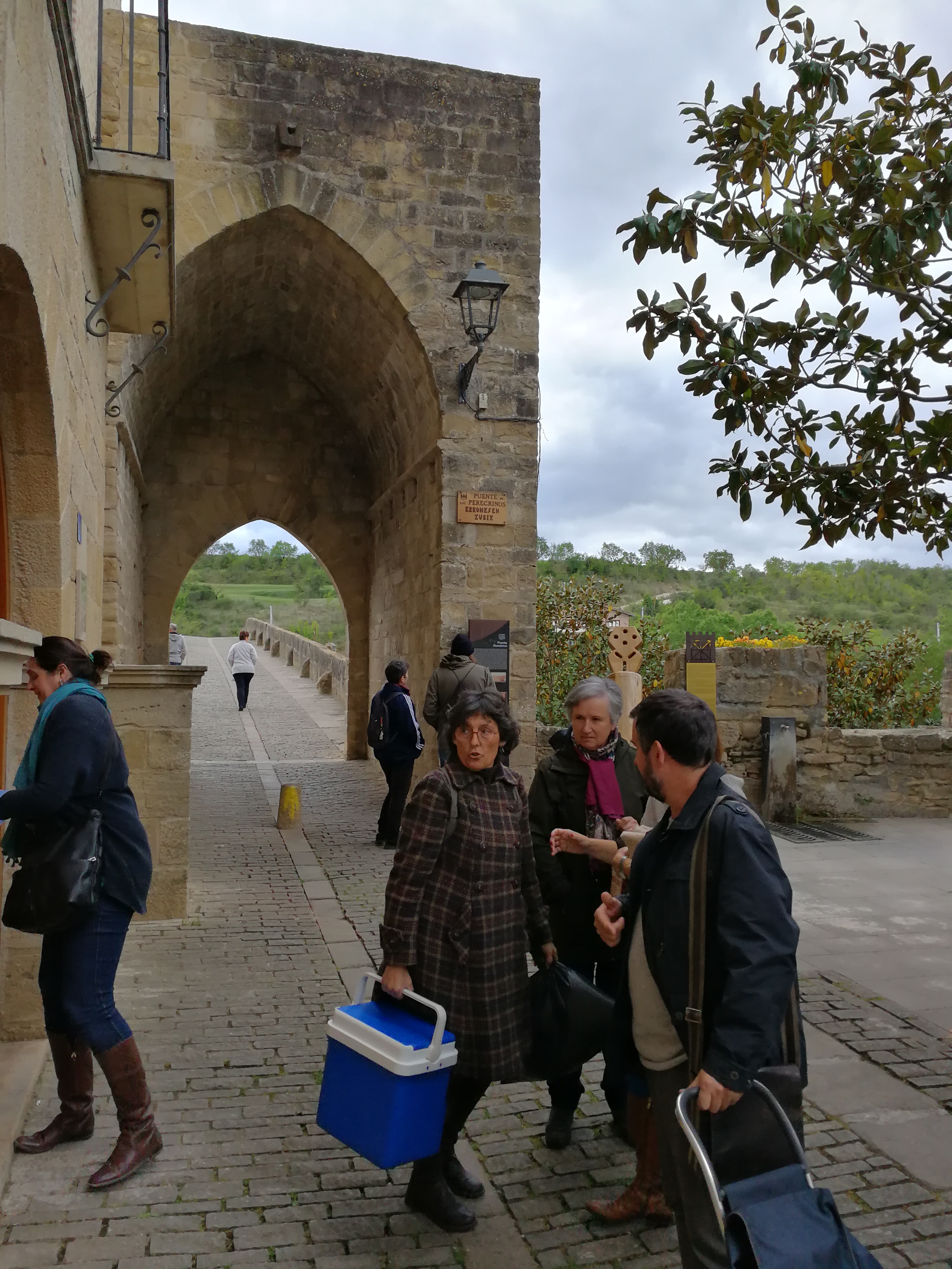 Una mañana fría y con lluvia. Caminaba por un parque eólico con el sonido de las aspas rodeándome. Uso un poncho de lluvia. Funciona muy bien. Pera faltaba los bares para un almuerzo. En los pueblos que pasaba tenía ninguno. Al fin Monreal. Trové el alberge y después anduve en el pueblo para trovar un restaurante. Pero ninguno. Hmm.. La ironía era que había uno bar-restaurante, muy anónimo, al lado de albergue en una casa de la iglesia. Una buena noche en este sitio con cena con peregrinos del albergue.