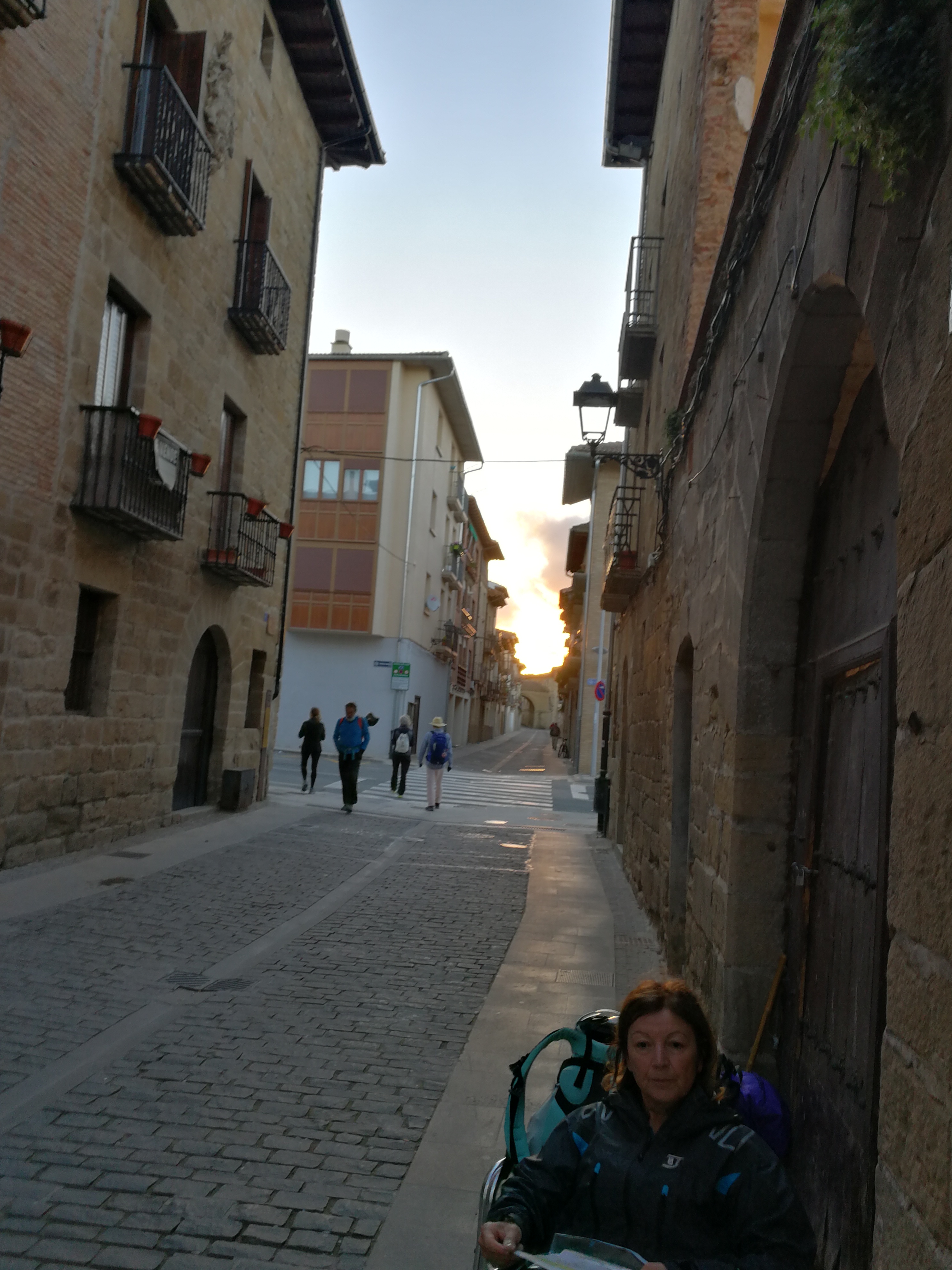 Una madruga cuando “todos” en el albergue comenzaba muy temprano. ¡Si este es el Camino Frances! Anduve a un bar que había visto la noche pasado y después andaba atrás. Pasé Obanos y unos pueblos más. Después pasé Alto de Perdón con sus siluetas de peregrinos y con todas estas piedras difíciles cuando subí la cuesta. Y – encontré muchas, muchas gentes. Quizá 500…600 personas. ¡Si este es el Camino Frances! Cizur Menor y Pamplona donde usaba el mismo hotel que hace dos años cuando atravesé Francia. Visité la estación de autobús y la plaza de toros con la estatua de Hemingway.
